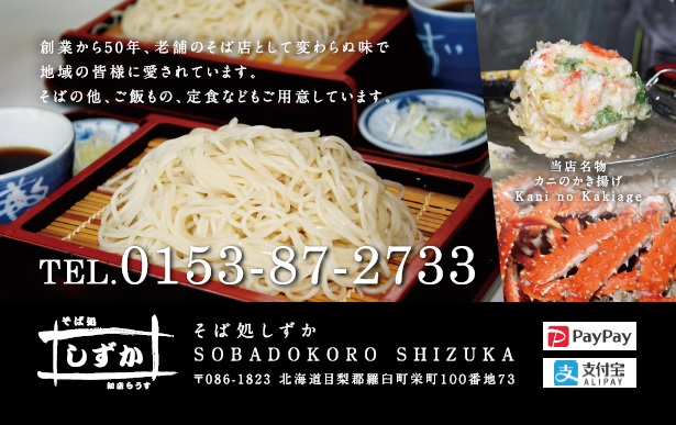 北海道羅臼町「そば処しずか」の石川と申します。当店は北海道は知床羅臼町で創業から50年、無添加の「手打ち更科そば」のお店です。創業当時の変わらぬ味で地域の皆様に愛され、地元の老舗のそば店として長年営業しています。 北海道を代表する海の幸「かに」をふんだんに使用した、当店の看板メニュー「カニかき揚げとそばセット」を是非、お召し上がりください。